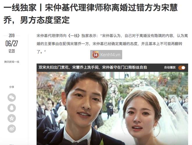 Theo đó, luật sư trả lời độc quyền chuyên mục "Nhất Tuyến" của QQ như sau: "Song Joong Ki cho rằng mình không có bất cứ điều gì phải giấu giếm về cuộc ly hôn này. Anh cho rằng vụ ly hôn này lý do chủ yếu là từ phía Song Hye Kyo. Song Joong Ki đã có quyết định cứng rắn về cuộc ly hôn này. Hai người khó có có thể "đảo ngược" lại tình thế".