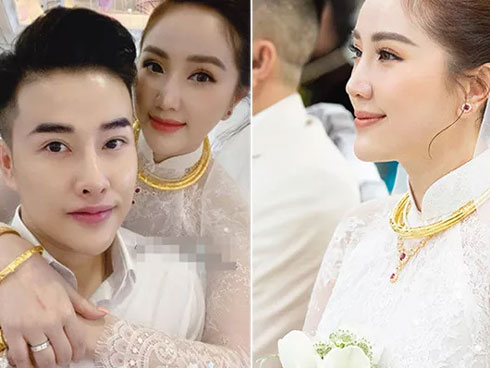 Tuy tổ chức giản dị, nhưng đám cưới Bảo Thy vẫn toát lên sự sang trọng, quý phái. Đặc biệt, nhiều khán giả phải trầm trồ trước số lượng trang sức vàng, kim cương cô dâu đeo trên người.