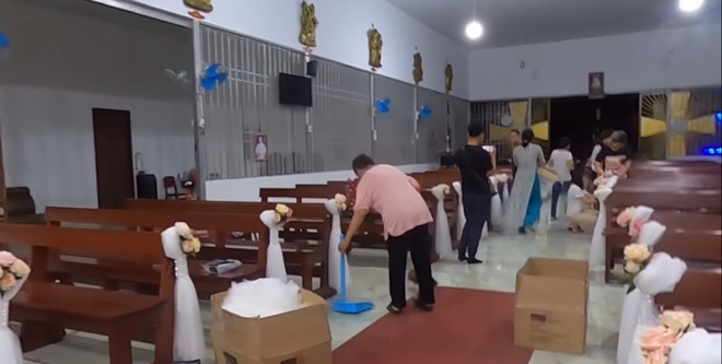 Trong nhà thờ, đích thân mẹ ruột Bảo Thy đang tự tay cắm từng bông hoa lên ghế để chuẩn bị cho lễ cưới của con gái diệu. Bà còn dán từng miếng vải trắng lên tường theo ý mình.