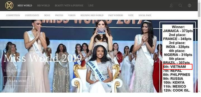 Mới đây, cộng đồng mạng đã truyền tay nhau hình ảnh trên trang chủ Miss World được cho là bảng xếp hạng chung cuộc của các thí sinh trong đêm chung kết. Bất ngờ hơn, Việt Nam đã xếp thứ 6 trong danh sách này, đồng nghĩa với việc Lương Thùy Linh suýt nữa thì đã có thể lọt vào Top 5.
