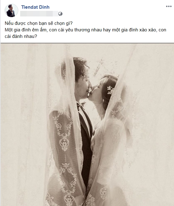 Mới đây, rapper họ Đinh bất ngờ đặt câu hỏi bày tỏ sự hoang mang về việc lựa chọn tổ ấm gia đình. Đính kèm ảnh cưới ngọt ngào bên bà xã Thụy Vy, Đinh Tiến Đạt trưng cầu dân ý: "Nếu được chọn bạn sẽ chọn gì? Một gia đình êm ấm, con cái yêu thương nhau hay một gia đình xào xáo, con cái đánh nhau?".