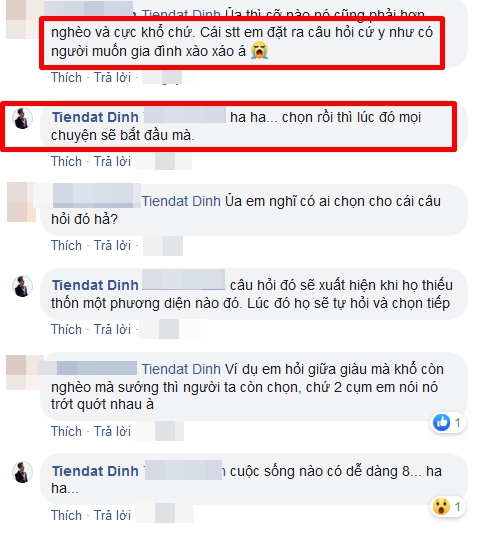 Trước ý kiến nghi ngờ: "Status em đặt ra câu hỏi cứ y như có người muốn gia đình xào xáo á?", Đinh Tiến Đạt cười lấp lửng: "Chọn rồi thì lúc đó mọi chuyện sẽ bắt đầu mà".