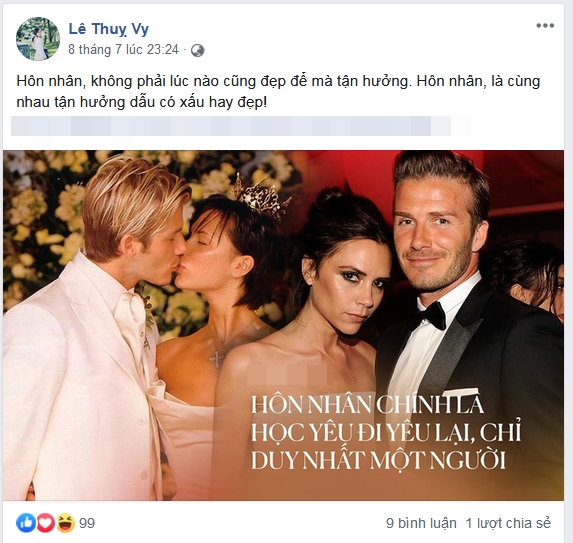 Cách đây ít ngày, Lê Thụy Vy cũng có dòng trạng thái khó hiểu. Bà xã Đinh Tiến Đạt dẫn link bài viết nói về cuộc hôn nhân viên mãn 20 năm của gia đình David Beckham có tựa đề: "Hôn nhân chính là học yêu đi yêu lại, chỉ duy nhất một người". Đính kèm bài viết, họ Lê tự nhắc nhở: "Hôn nhân, không phải lúc nào cũng đẹp để mà tận hưởng. Hôn nhân, là cùng nhau tận hưởng dẫu có xấu hay đẹp!".
