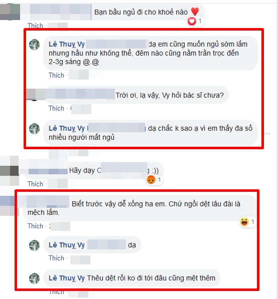 Bên cạnh đó, một người chị khác lại lo lắng nhắc Lê Thụy Vy đi bác sĩ kiểm tra khi cô chia sẻ thường xuyên mất ngủ. Bà xã họ Đinh trấn an: "Em cũng muốn ngủ sớm lắm nhưng hầu như không thể, đêm nào cũng nằm trằn trọc đến 2 - 3 giờ sáng nhưng chắc không sao vì đa số bà bầu đều bị mất ngủ vậy".