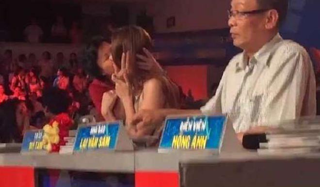 Riêng với nụ hôn của Đàm Vĩnh Hưng - người từng ngỏ lời tán tỉnh cô, Mỹ Tâm phản ứng lại bằng nụ cười sảng khoái.