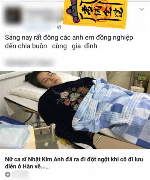 Hôm nay (7/8), Nhật Kim Anh bất ngờ bị một số nhóm kín trên mạng tung tin đã qua đời sau chuyến lưu diễn tại Hàn Quốc. Thậm chí những người này còn cho biết rất nhiều bạn bè, đồng nghiệp của nữ ca sĩ này đã tới chia buồn cùng với gia đình của cô.