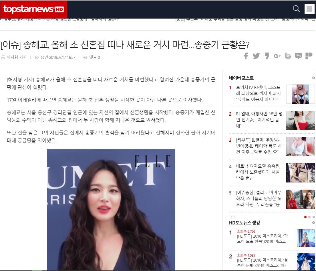 Mới đây, theo thông tin đăng tải trên tờ Topstarnews của Hàn đã đăng tải bài viết về thông tin Song Hye Kyo đã chuyển ra khỏi nhà ở đường Gyeongridan, quận Yongsan, Seoul.