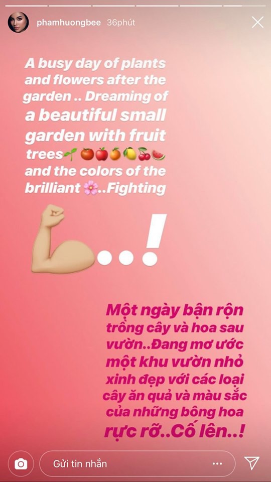 Nội dung này được cô cẩn thận viết bằng cả tiếng Anh lẫn Việt có lẽ là để cho bạn bè, fan Việt Nam lẫn quốc tế có thể hiểu được. Cụ thể, cô chia sẻ: "A busy day of plants and flowers after the garden... Dreaming of a beautiful small garden with fruit trees and colors of brilliant. Fighting!"