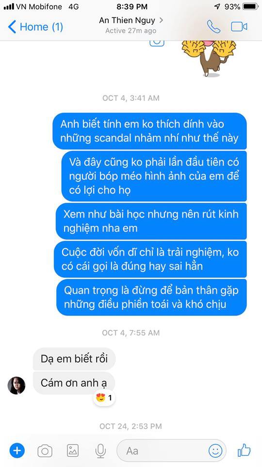Đi kèm dòng trạng thái này, hot facebooker đăng bức ảnh chụp đoạn tin nhắn giữa anh và An Nguy vào ngày 4/10, tức thời điểm scandal tình tay ba vừa mới nổ ra. Theo đó, người này đã khuyên An Nguy rằng: "Anh biết tính em không thích dính vào những scandal nhảm nhí như thế này. Và đây cũng không phải lần đầu tiên có người bóp méo hình ảnh của em để có lợi cho họ. Xem như bài học nhưng nên rút kinh nghiệm nha em. Cuộc đời vốn dĩ chỉ là trải nghiệm, không có cái gọi là đúng hay sai hẳn. Quan trọng là đừng để bản thân gặp những điều phiền toái và khó chịu."