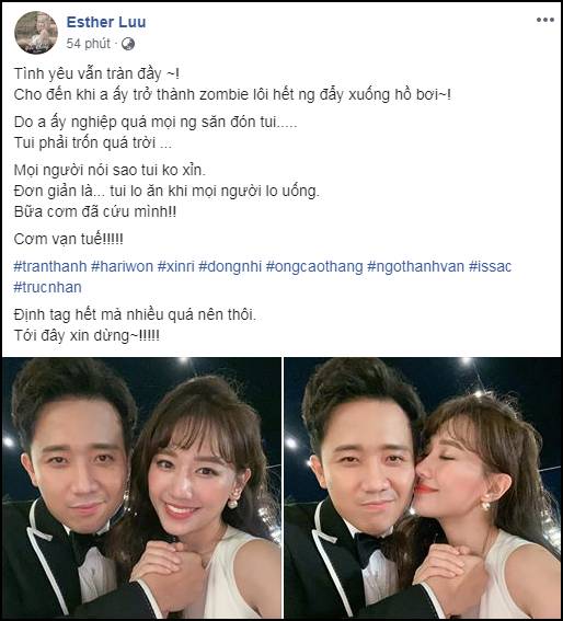 Cụ thể, giọng ca Hương đêm bay xa chia sẻ: "Tình yêu vẫn tràn đầy cho đến khi anh ấy trở thành zombie lôi hết người đẩy xuống hồ bơi. Do anh ấy nghiệp quá mọi người săn đón tui... Tui phải trốn quá trời".
