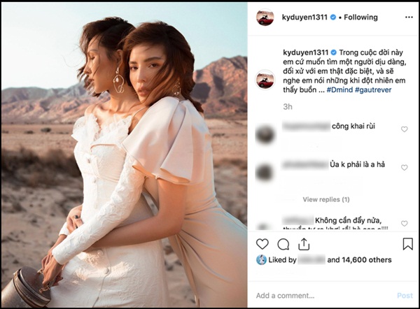 Nhưng ngày 19/4 vừa qua, Kỳ Duyên được cho là có động thái công khai tình cảm với chân dài làng mẫu trên mạng xã hội. Đăng hình bức ảnh ôm eo Minh Triệu, Hoa hậu Việt Nam 2014 kèm theo lời nhắn gửi: “Trong cuộc đời này em cứ muốn tìm một người dịu dàng, đối xử với em thật đặc biệt, và sẽ nghe em nói những khi đột ngột em thấy buồn”.