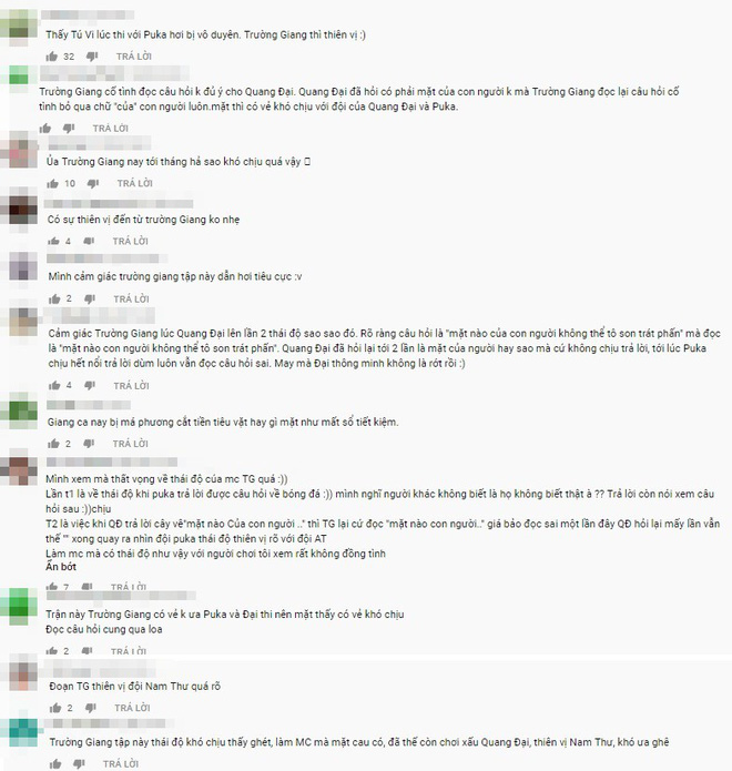 Ngoài ra, Trường Giang còn bị chỉ trích vì thái độ thiếu tin tưởng khi Puka thực hiện phần thi của mình. Cụ thể, trong lúc Puka trả lời đúng các câu hỏi liên quan tới bóng đá, anh liên tục bắt bẻ và nghi ngờ cô được đồng đội nhắc.
