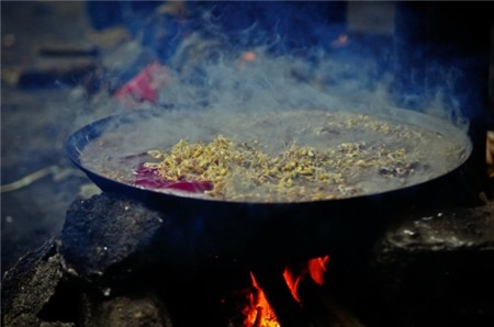 cố khi nấu xong, được múc ra muôi bằng gỗ, thêm chút ớt, chút tiêu, gia