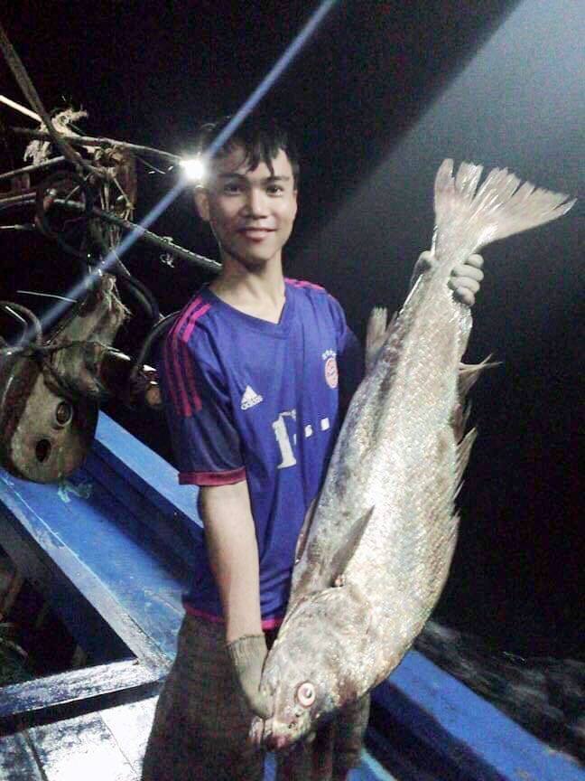 Anh Bùi Đình Quý bên cạnh con cá nghi là cá sủ vàng vừa đánh bắt được tại vùng biển Quảng Trị