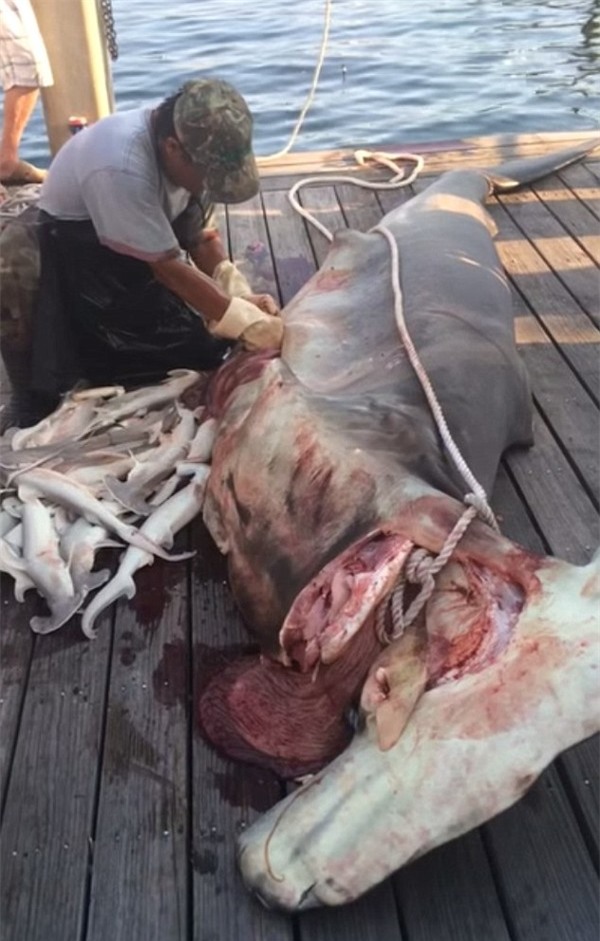Ngư dân mổ bụng xác cá mập mẹ để lấy 34 cá mập con ra ngoài.