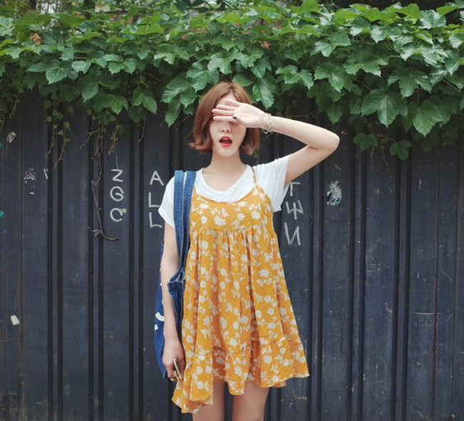 Họa tiết hoa lá vừa vui mắt lại trẻ trung. Dáng đầm yếm xếp ly này không hề kén người mặc, bất kể bạn trọn trịa hay mi nhon.