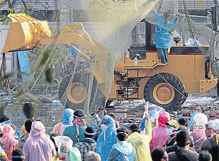 Những người biểu tình lái xe ủi trên đường phố Bangkok.
