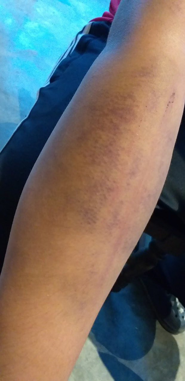 Cả 2 tay cháu đều có nhiều vết bầm tím.