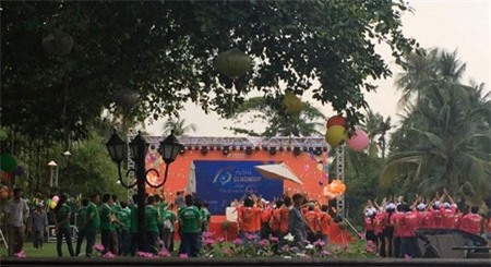 Hàng trăm nhân viên kinh doanh của hệ thống siêu thị dự án bất động sản STDA xếp hàng hát "Cen ca". Ảnh: Vietnamnet |