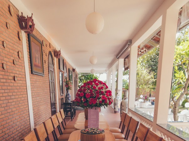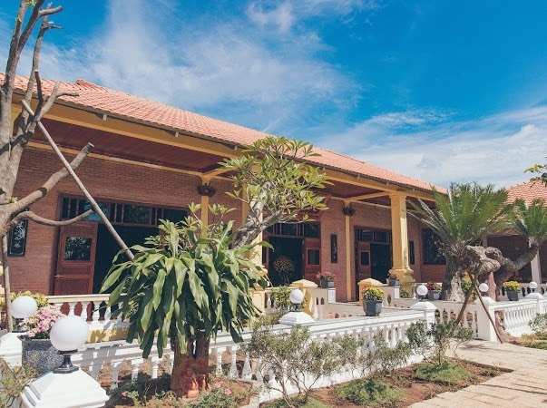 Công trình xây dựng mang dấng dấp biệt phủ, được bao bọc bởi những bức tường gạch đỏ xây tay mỹ thuật, bức tường kéo dài hàng ngàn m2.
