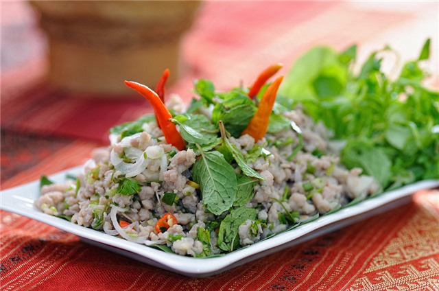 mặn thông dụng nhất ở đây là Larb, được làm từ thịt gà, lợn, vịt, cá