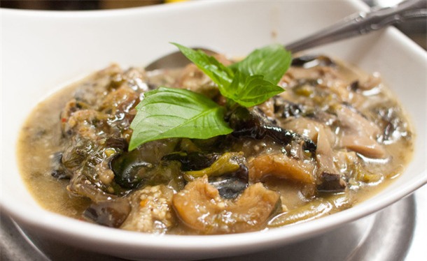 cà tím, đậu, nấm đen và bí (một số nơi có thể cho thêm thịt) hầm nhừ. Or
