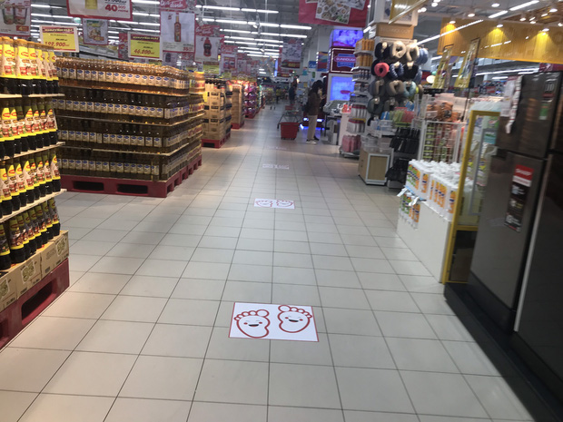Tại Big C Thăng Long, dù người dân đến mua hàng không nhiều nhưng vẫn được dán biểu tượng bàn chân dưới sàn nhà để giữ khoảng cách tối thiểu 2m so với người xung quanh.