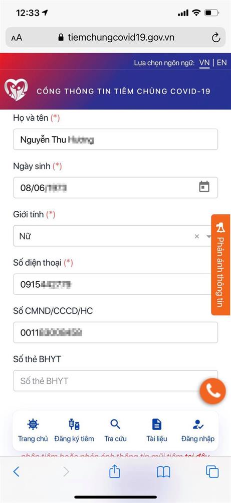 Trường hợp không có thông tin, người dân chọn mục "Phản ánh thông tin" (màu cam, phía bên phải giao diện màn hình) để gửi yêu cầu phản ánh cập nhật thông tin tiêm chủng vắc-xin phòng COVID-19.