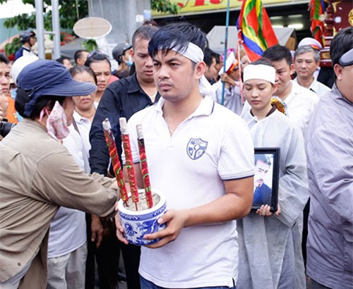 Trong khi mẹ và các chị gái gục ngã, Kiều Oanh và em trai nén thương đau trong lòng để đưa linh cữu Duy Nhân lên xe. Duy Nhân trút hơi thở cuối cùng lúc 0h30’ ngày 7/5 tại bệnh viện Truyền máu Huyết học TP HCM sau hơn 6 tháng đấu tranh với căn bệnh ung thư máu. |
