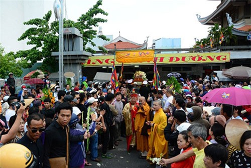 Đoạn đường trước chùa Vĩnh Nghiêm (TP HCM) tắc nghẽn khi hàng nghìn người đi theo đưa tiễn linh cữu nam diễn viên sinh năm 1986.