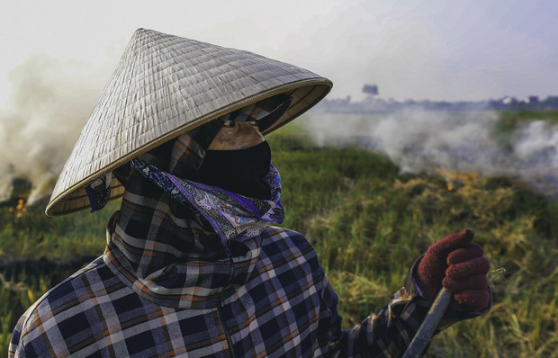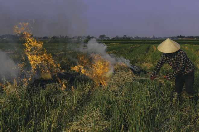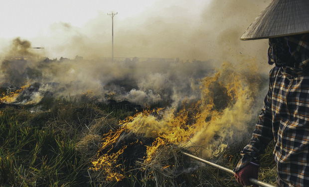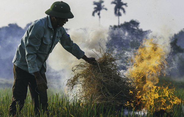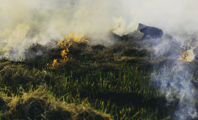 Khói bụi từ việc đốt rơm rạ bay lên mù mịt.