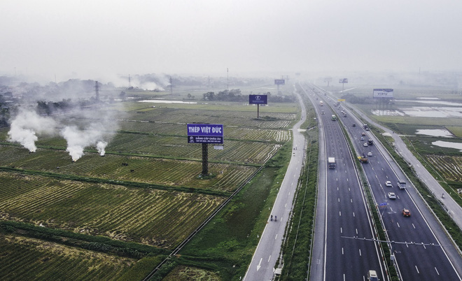 Khói rơm rạ "bủa vây" trên cao tốc Hà Nội - Ninh Bình có thể gây nguy hiểm cho người tham gia giao thông. Bất cứ người nào lái xe qua khu vực này cũng phải giảm tốc độ. Khói mù bay lên không trung làm giảm tầm nhìn của các lái xe.