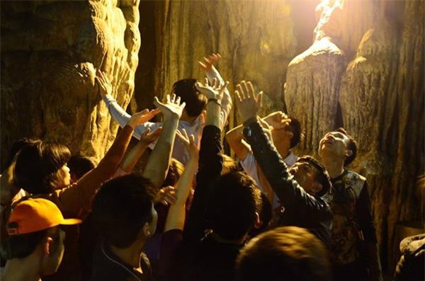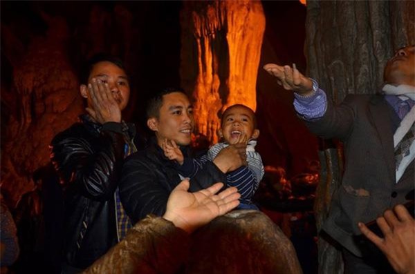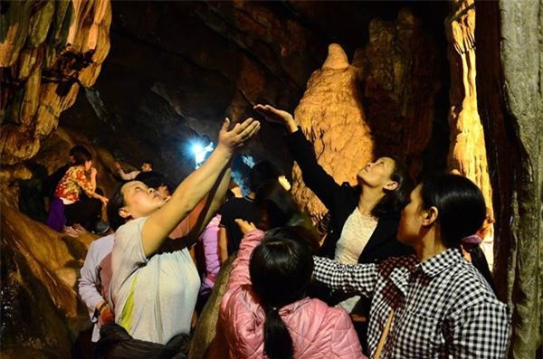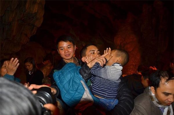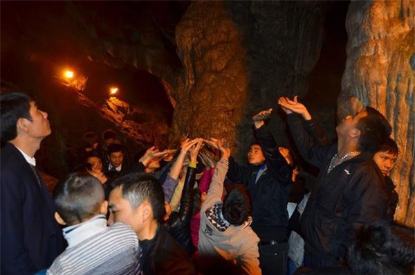 Ở một góc khác nhiều du khách chen lấn xô đẩy nhau để hứng được nước "lộc" (thực chất là nước mạch ngầm chảy ra từ nhũ đá) vào các đồ lễ của mình.