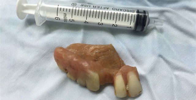 Hàm răng giả lớn được các bác sĩ gắp ra ngoài thành công. |