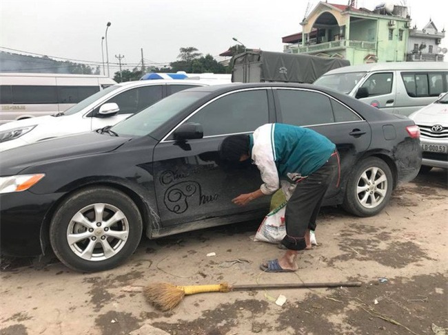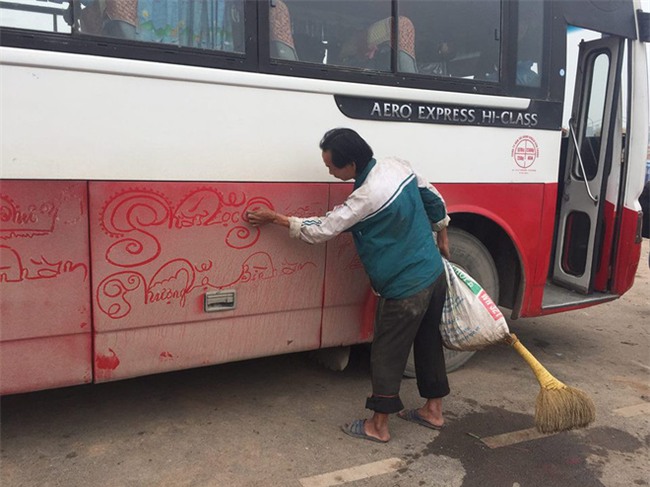 Bên cạnh đó, hình ảnh người "họa sĩ" thực hiện những hình vẽ cũng được ghi lại. Đó là 1 người đàn ông với mái tóc dài ngang cổ, mặc chiếc áo đồng phục học sinh, chiếc quần xắn lên nhiều gấu còn chân thì mang đôi dép nhựa đế đã mòn. Người đàn ông ấy đứng chăm chú vẽ những lời chúc ý nghĩa từ lớp bụi bẩn trên xe ô tô bằng chính bàn tay trái của mình, tay phải không quên nắm chặt chiếc chổi cùn và chiếc bao tải khá nặng.
