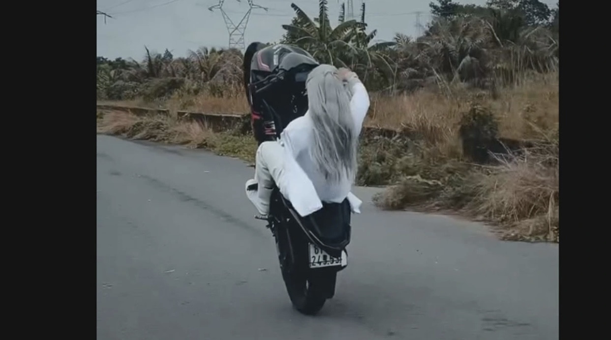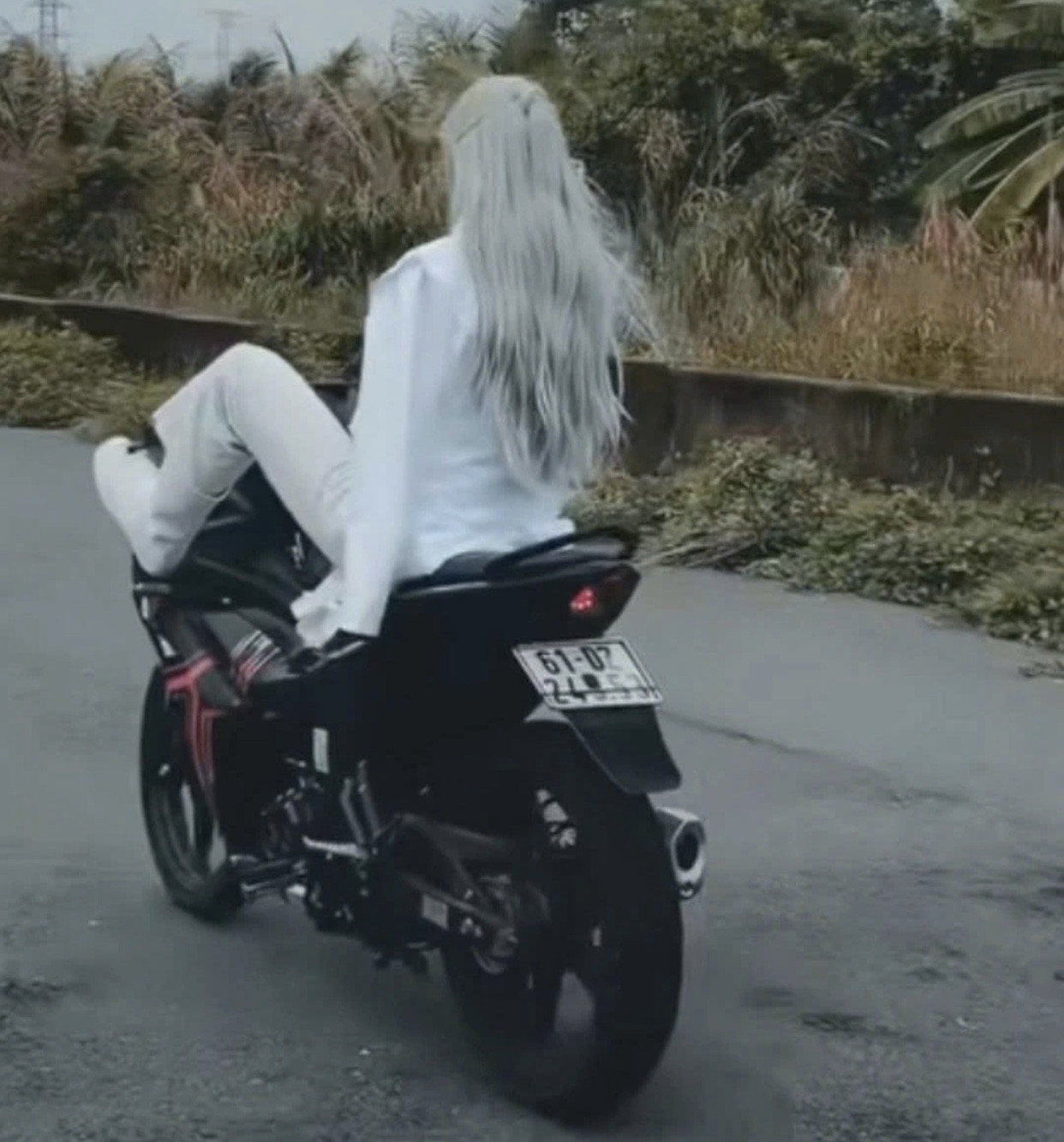 Quan sát đoạn clip sẽ thấy người đàn ông mặc áo trắng, quần trắng, tóc trắng, chạy xe máy biển số tỉnh Bình Dương bằng chân. Tiếp đó, người này còn thực hiện động tác "bốc đầu" xe máy bằng 1 tay, di chuyển bằng bánh sau trên đoạn đường dài.