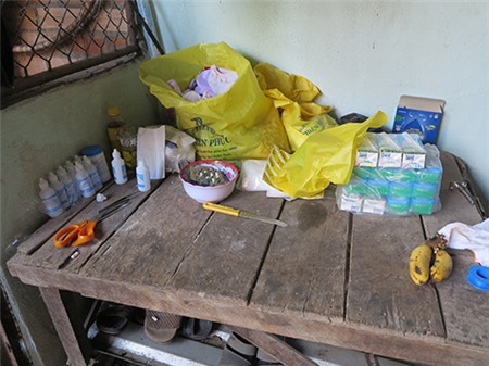 Thuốc men được đặt trên một tấm phản gỗ cũ kĩ