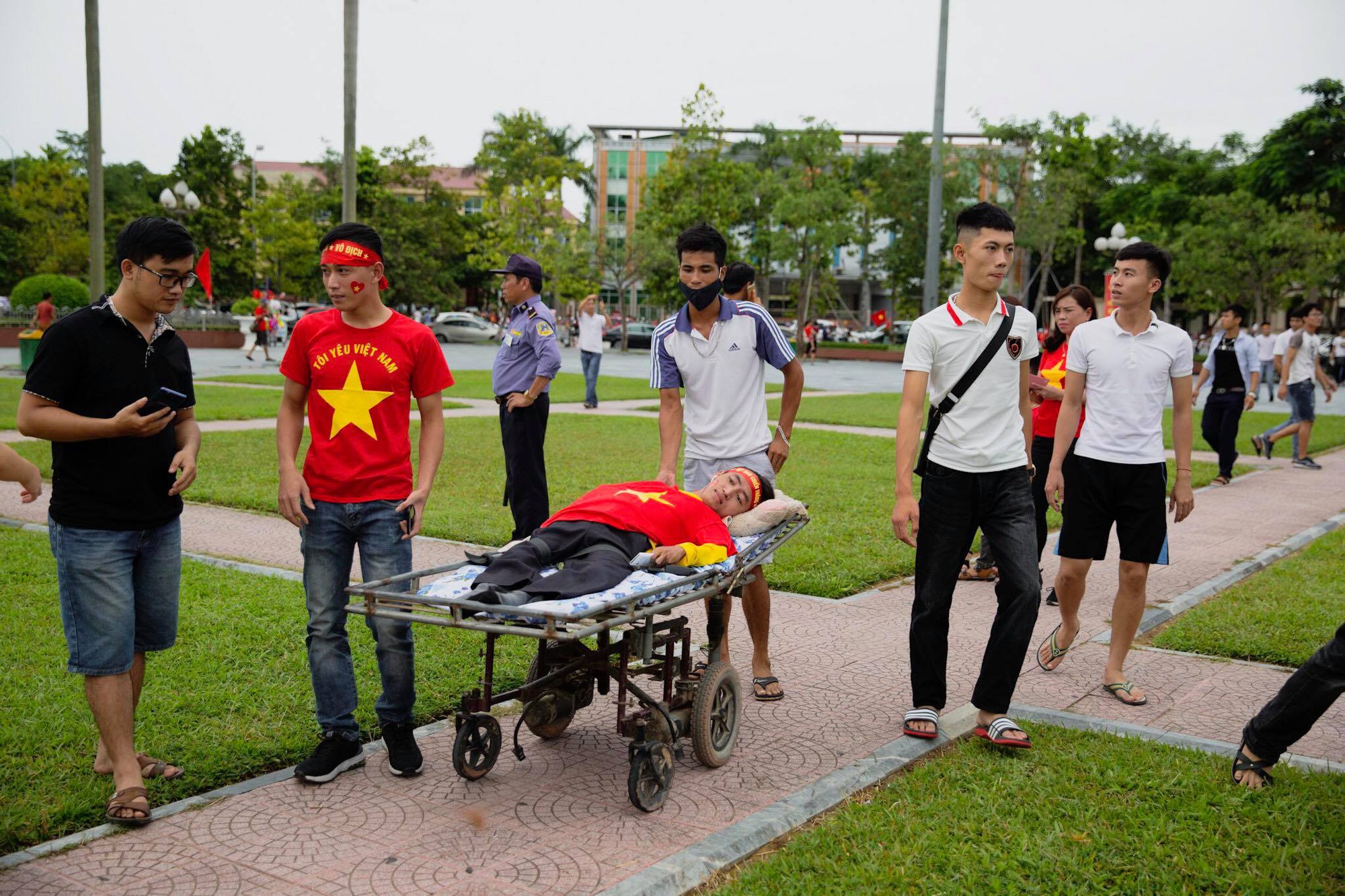 Trong hình ảnh ấy, giữa hàng trăm người hâm mộ của trái bóng tròn, người đàn ông một mình nằm trên xe cáng, cả tay và chân anh đều teo nhỏ như chỉ còn da bọc xương. Anh không thể đứng, cũng chẳng thể vỗ tay hô hào cổ vũ cho đội tuyển Việt Nam, nhưng anh đã thể hiện tinh thần của mình bằng cách đội trên đầu băng rôn chiến thắng cùng mặc lên người chiếc áo đỏ sao vàng.