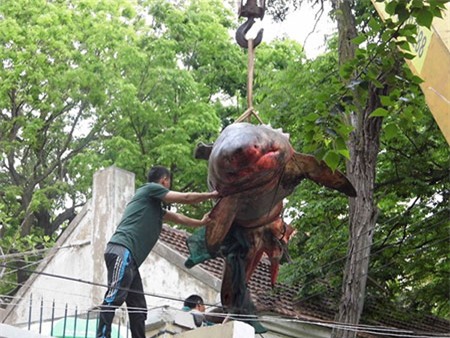 Những người đàn ông đang cố gắng đưa con cá mập vào trong nhà bằng chiếc máy cẩu. |