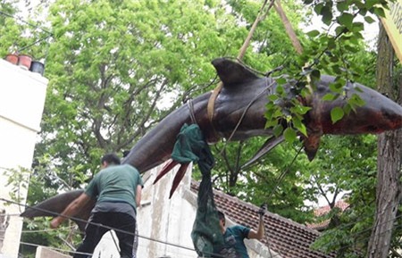 Ông Trương, người chứng kiến sự việc chia sẻ, con cá mập có chiều dài khoảng 6m và nặng vài trăm kg. Trước đây, chủ nhân của con cá từng nói với ông rằng mua về để làm tiêu bản.