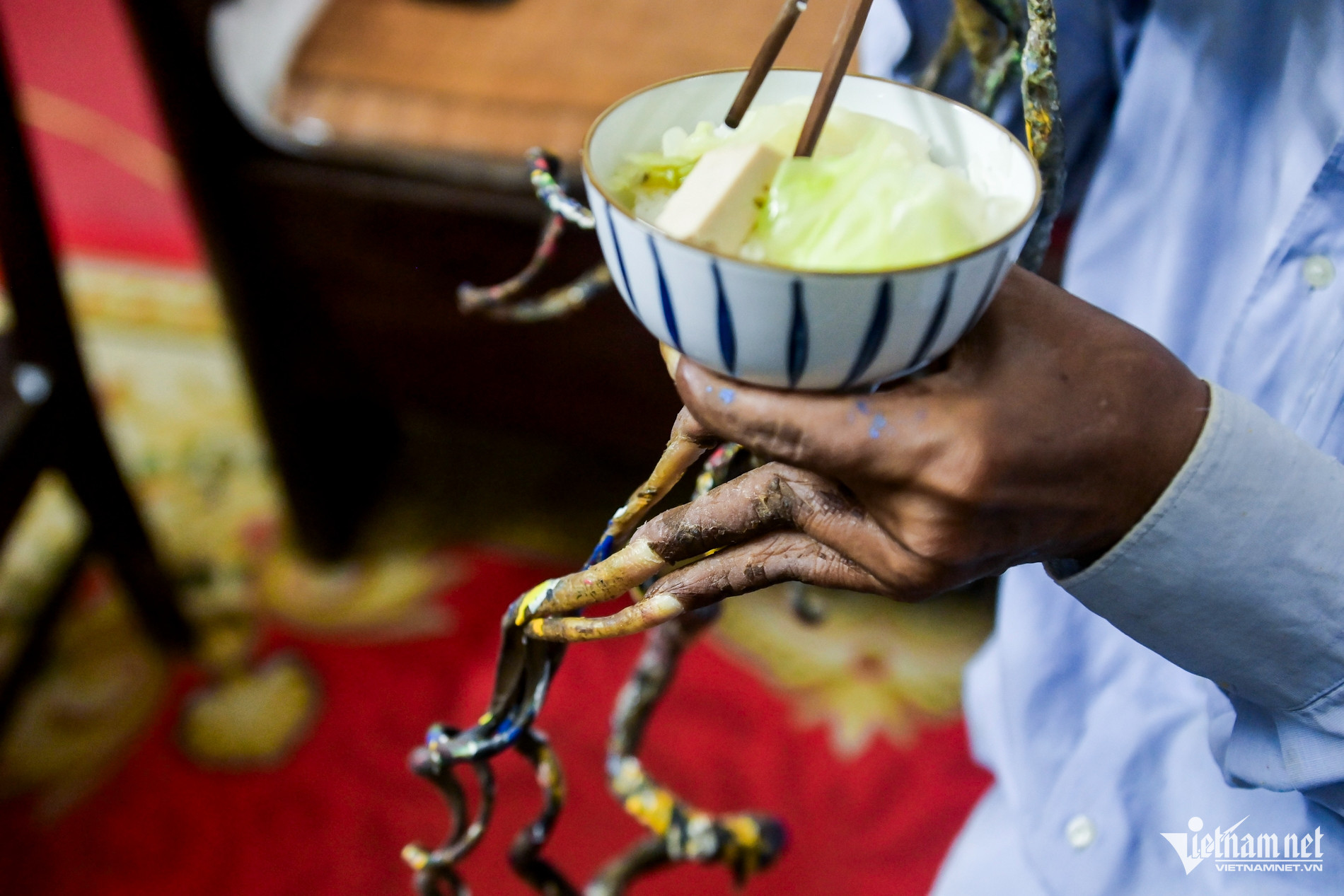 Ban đêm, khi ngủ, ông phải kê tay lên gối cho móng khỏi bị đè.