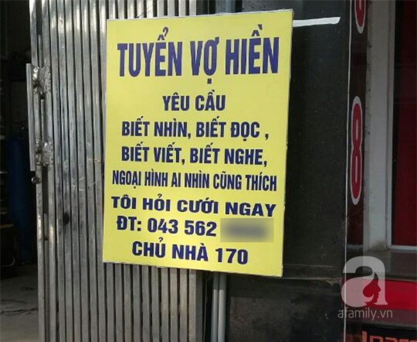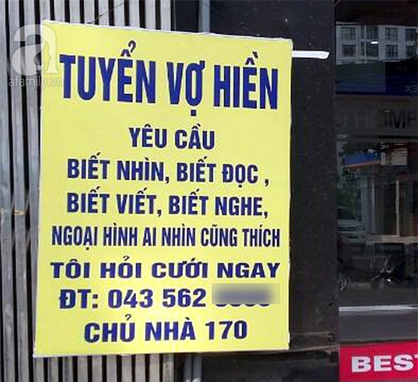 Ít ngày gần đây, tại số 170 Đường Láng, Q. Đống Đa, Hà Nội bất ngờ xuất hiện một tấm biển “tuyển vợ hiền” kèm theo những yêu cầu khiến không ít người chết cười.