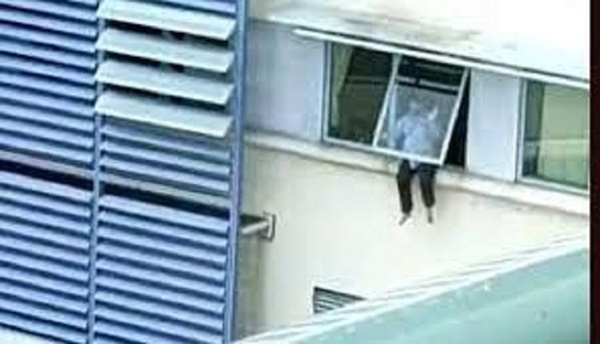 Trong hình ảnh ghi lại được, anh ta treo thân mình bên ngoài cửa sổ tầng 5, dường như muốn nhảy xuống. Bên trong có thể thấy rất nhiều người xúm lại khuyên ngăn, ai nấy đều thót tim trước tình cảnh nguy hiểm lúc đó.