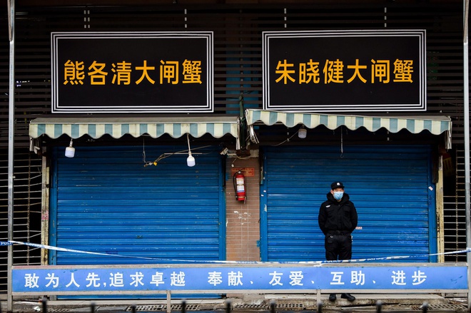 Khu chợ hải sản Huanan, nơi nghi ngờ bùng phát dịch virus corona đã bị đóng cửa từ 22/1 và luôn có bảo vệ canh gác. Ảnh: Getty Images. |
