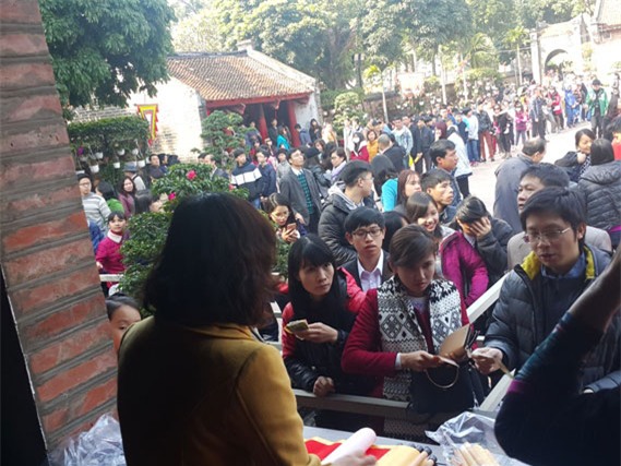 nhiều người vẫn vào trong Văn Miếu để xin chữ dù phải xếp hàng dài chờ