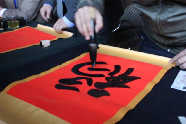 Hai bạn trẻ vui vẻ bên 4 chữ “nhẫn, thọ, tài đức, phúc” mới xin được cho từng thành viên và gia đình.