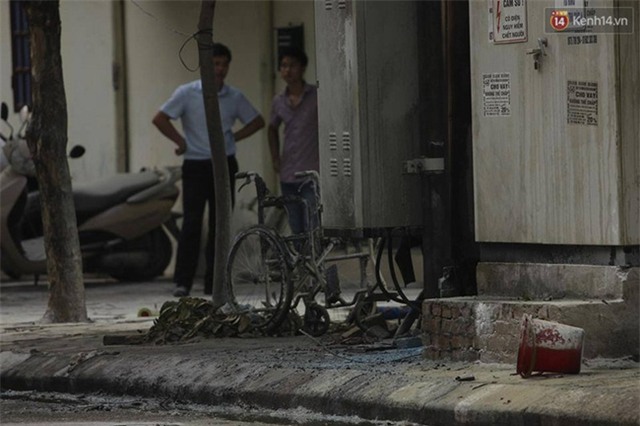 Đến gần 17h chiều cùng ngày lực lượng công an vẫn đang tiếp tục phong tỏa hiện trường, điều tra nguyên nhân vụ việc. Tại hiện trường một xe máy bị cháy cùng với chiếc xe lăn, hàng hóa bán nước của cặp vợ chồng già bị hư hỏng gần như toàn bộ. Cạnh đó là một số vật dụng, quần áo của nạn nhân vứt lại ở hiện trường.