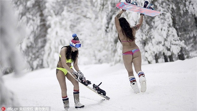 Katy Khmelevskaya và Veronica Kalugina gây chú ý khi mặc bikini để trượt tuyết giữa nền nhiệt ngoài trời đang là -15 độ C.