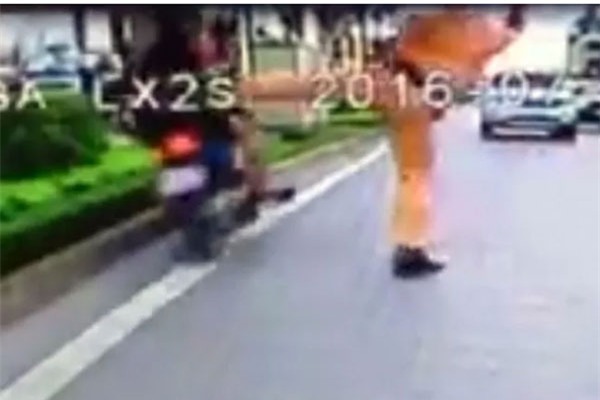 Theo clip, người mặc trang phục CSGT chạy từ vỉa hè, lao ra giữa đường chặn bắt nhóm đi xe máy. Sau khi người này giơ chân lên, chiếc xe mất lái, đâm vào dải phân cách cứng rồi trượt trên mặt đường. 2 thanh niên trên xe máy văng lên phần đất nằm giữa dải phân cách, gần đó là tủ điện.
