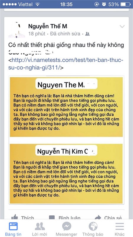 Facebook Trần Ng.Ch. cũng tỏ ra khá hài lòng khi nhận được khám phá ý nghĩa tuyệt vời trong tên mình với status: “Cũng được đó, không tồi chút nào”. Bên dưới dòng trạng thái này là những lời khá hoa mỹ từ ứng dụng: “Tên bạn có nghĩa là bạn có hoài bão, nhân từ và thẳng thắn. Bạn là người luôn có mục tiêu, khi có việc để làm, mọi người nghĩ đến bạn trước tiên…”.